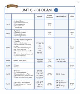 The Cholom Guidebook builds off of the knowledge students have learned in previous lessons (Kamatz, Patach, Tzeireh, Segol, Sh’va). It focuses on: