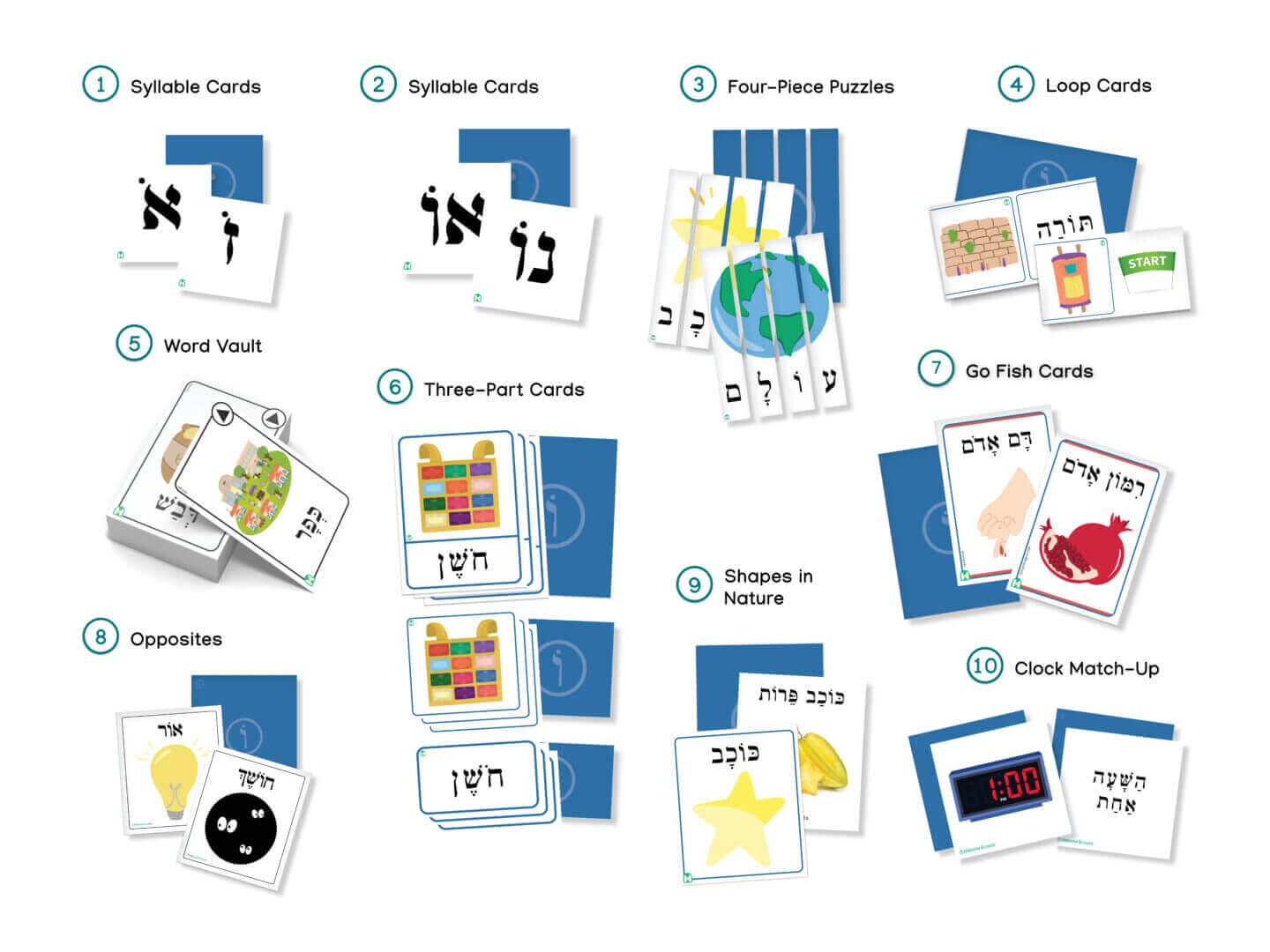 The cholom game pack builds off of students’ knowledge from previous lessons and concentrates on exposing students to the two different cholom variations. This game pack works on building nouns, verbs, and adjectives, with a lot of focus on learning colors, shapes, and numbers. Added features include a Go-Fish style game to practice Hebrew colors, games to find shapes in nature, as well as using Hebrew number names to practice clock math.