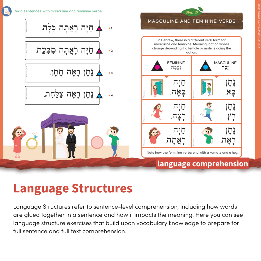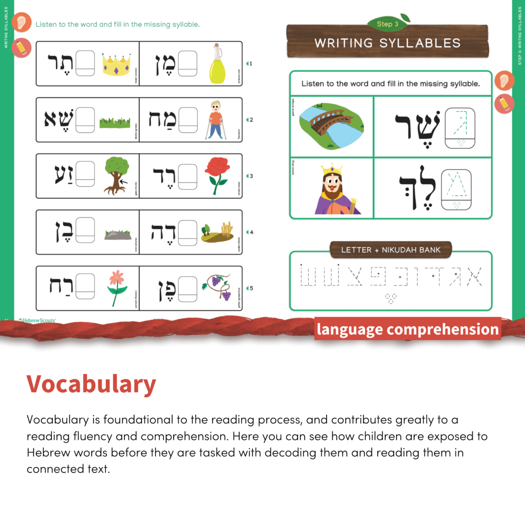 Hebrew Scouts is a structured literacy curriculum rooted in Torah mesorah that emphasizes all four components of language (listening, speaking, reading, and writing), which aligns with the language-based model, and builds up skills through exposure. Focusing on both oral and written language, Hebrew Scouts systematically and sequentially teaches Hebrew reading and language from the bottom up, while providing a rich, holistic Hebrew experience that harmoniously works together with it from the top down.